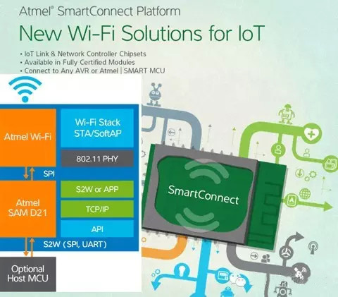 鉴于物联网市场的强大攻势,Atmel在融合其在无线与控制两方面的强大优势,2014年6月份,Atmel推出了全新的MCU品牌--Atmel SMART以及SmartConnect SAM W23模块,该模块基于 Atmel超低功率WiFi系统芯片,实现了低功率MCU与Wi-Fi解决方案的结合。SAM W23模块整合了WiFi功能,设计人员无需再学习WiFi堆栈,从而能够专注于提升产品功能。