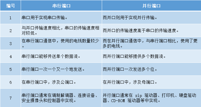 串口是用于连接串口线以实现串口通信的接口。这些端口可以对接一个连接传输线的9针D形连接器,称为DB-9连接器。通过单线获得的串行通信,只有单一的数据流从一端传输到另一端。因此,与并行传输一样,在串行传输中数据速度不匹配不是问题。电线的长度可以根据需要增加。