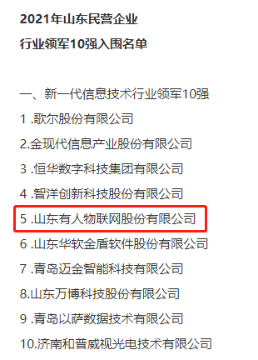凭借在物联网领域的持续贡献与影响力,山东有人物联网股份有限公司成功入围2021年山东民营企业新一代信息技术行业领军10强。