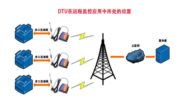 DTU是数据终端设备(Data Terminal unit)的简写。广义地讲,在进行通信时,传输数据的链路两端负责发送数据信息的模块单元都称之为DTU,在它的作用下对所传信息进行格式转换和数据整理校验。狭义地讲,DTU一般特指可以把传感器/流量计/PLC/单片机等串口(RS232/RS485/TTL)设备采集的数据,通过GSM/GPRS网络(就是手机网络)将数据发送到指定的服务器(就是数据采集平台/数据监控平台等),服务器接收到数据可以进行分析、处理、显示、保存等操作,同时也可以通过DTU发送一些信息给远端的串口设备,去执行一些动作。