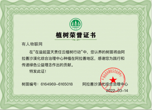 近日,在第44个植树节来临之际,由山东省自然资源厅指导,山东省互联网传媒主办的“在益起·蓝天责任”云植树行动启动。有人物联网董事长古欣带领并号召全体员工积极参与此次云端植树活动,通过云端认养树苗、线下专人种植养护,建造有人物联网公益林,助力阿拉善沙漠筑起绿色屏障、生命防线,守护我们的碧海蓝天。