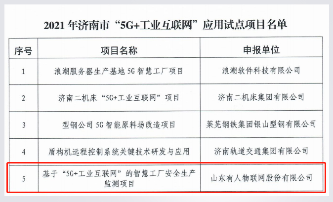 3月1日,济南市工业和信息化局发布《关于公布2021年济南市“5G+工业互联网”应用试点示范项目名单的通知》。有人物联网“基于‘5G+工业互联网’的智慧工厂安全生产监测项目”成功获选。