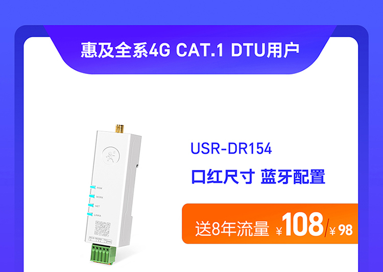 以DR154为例,产品+八年流量仅售108元。108元,即可拥有:性能超强的DTU产品+八年流量+有人品质服务,这也太划算了! 八年的流量基本能覆盖电子产品的生命周期,意味着全程无需用户再自购流量,解决了充值续费的烦恼。