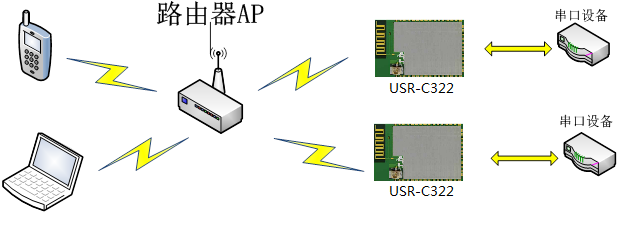WIFI模块作为STA是一种最常用的组网方式,由一个路由器AP和许多STA组成,如下图。其特点是AP处于中心地位, STA之间的相互通信都通过AP转发完成。
