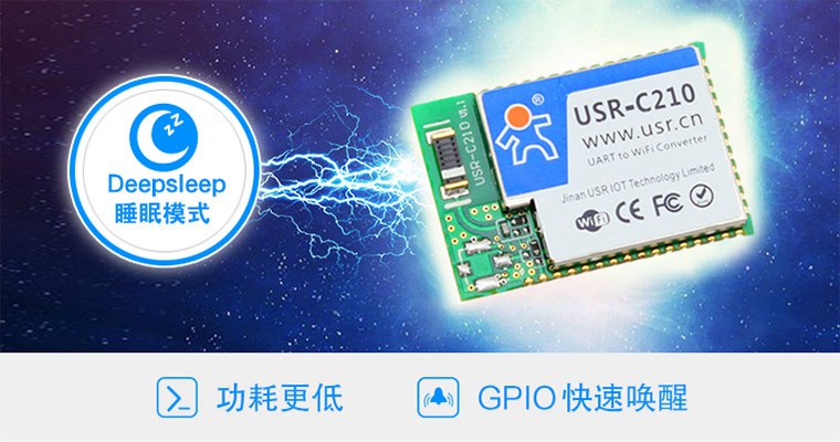 wifi模块C210可以通过设置倒计时进入Deepsleep模式,维持在90ua的超低功耗,可以通过GPIO快速唤醒。