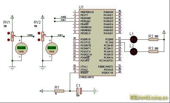 仿真说明:当AIN1低于AIN0时L1(绿灯亮),当AIN1高于AIN0时L2亮(黄灯亮)。