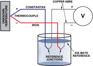 在参考接合点处产生的电压取决于测量接合点和参考接合点两处的温度。由于热电偶是一种差分器件而不是绝对式温度测量器件,必须知道参考接合点温度以获得精确的绝对温度读数。这一过程被称为参考接合点温度补偿(冷接合点补偿)。