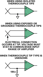 设计热电偶信号调理时应在测量接地热电偶时避免接地回路,还要在测量绝缘热电偶时具有一条放大器输入偏压电流路径。此外,如果热电偶尖端接地,放大器输入范围的设计应能够应对热电偶尖端和测量系统地之间的任何接地差异(图5)。
