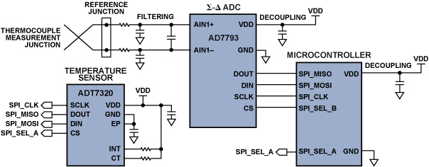 第二种解决方案提供最高测量精度,还可使用各种热电偶类型。作为一种基于软件的参考接合点补偿技术,它依赖于高精度ADT7320数字温度传感器来提供精度远超迄今所实现精度的参考接合点补偿测量。ADT7320在–40°C至+125°C温度范围完全校准并指定。完全透明,不同于传统的热敏电阻或RTD传感器测量,它既不需要在电路板装配后进行高成本的校准步骤,也不会因校准系数或线性化程序而消耗处理器或内存资源。其功耗只有数毫瓦,避免了降低传统电阻式传感器解决方案精度的自发热问题。