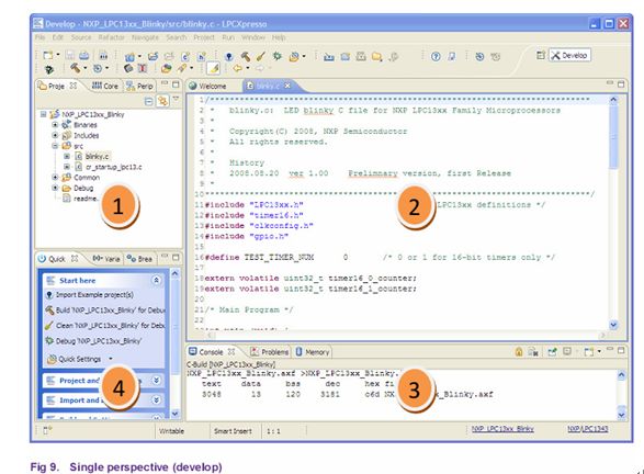 在LPCXpresso开发界面里,快速启动面板里包含了使用最频繁的各种操作选项。它位于窗口的左下角。