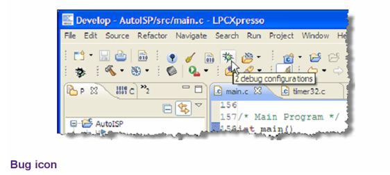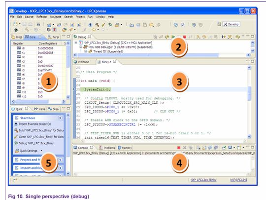 然后就可以从项目列表中选择例程项目。要确保“Blinky”和“CMSIS”这两个项目都存在。单击“Finish”,这两个项目将会被导入到当前工作区。在快速启动面板里单击“Build all projects(Debug)”开始编译Blinky例子和CMSIS库。5.2 在开发板上调试/运行“blinky”程序 LPCXpresso开发界面下,当开始调试的时候,程序会自动下载到目标MCU的flsh中。 在项目管理区中选中将要调试的项目,然后点击快速启动面板中的“Debug project ‘Blinky’”。这时会弹出一个询问你使用哪种执行方式(发布或调试,Release or Debug)选项的对话框,选择“Debug(调试)”选项,然后单击“OK”完成程序下载和创建项目调试操作。如下图所示。