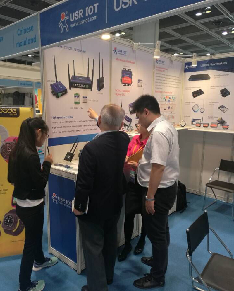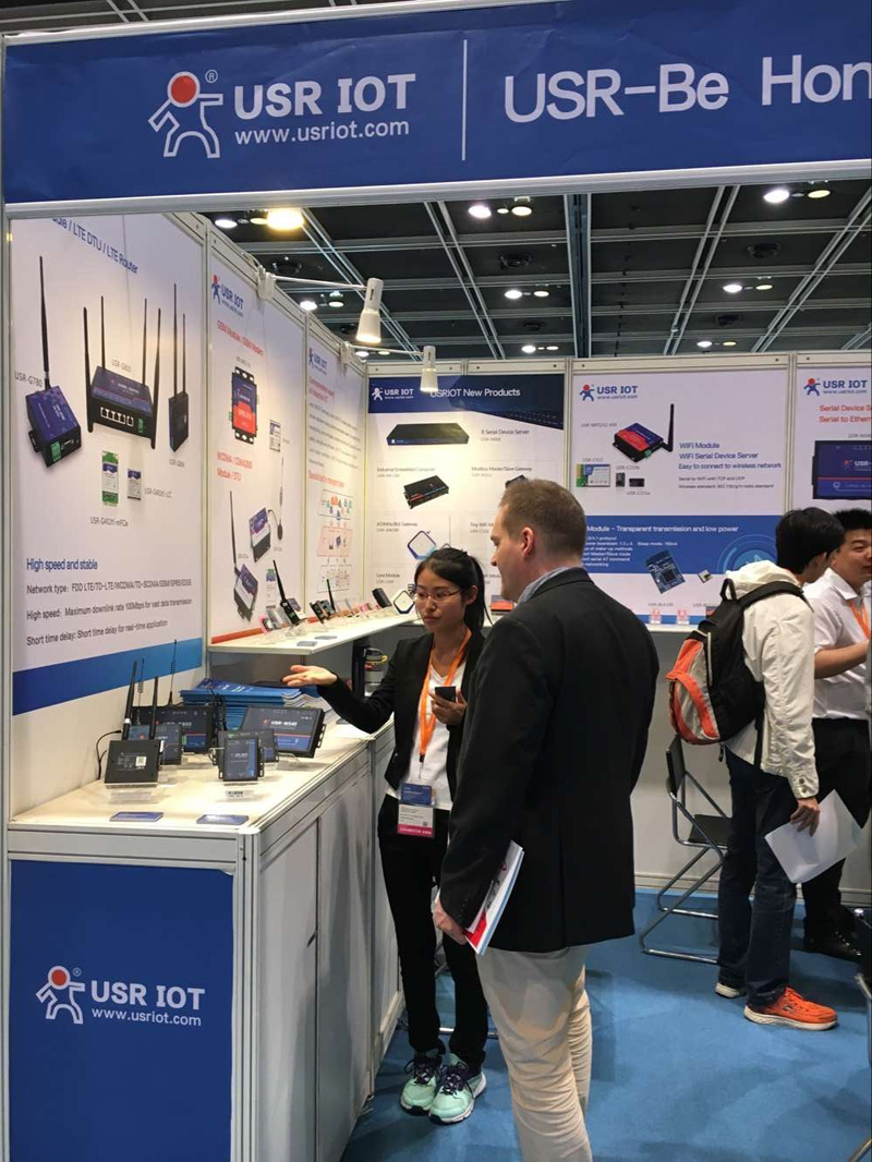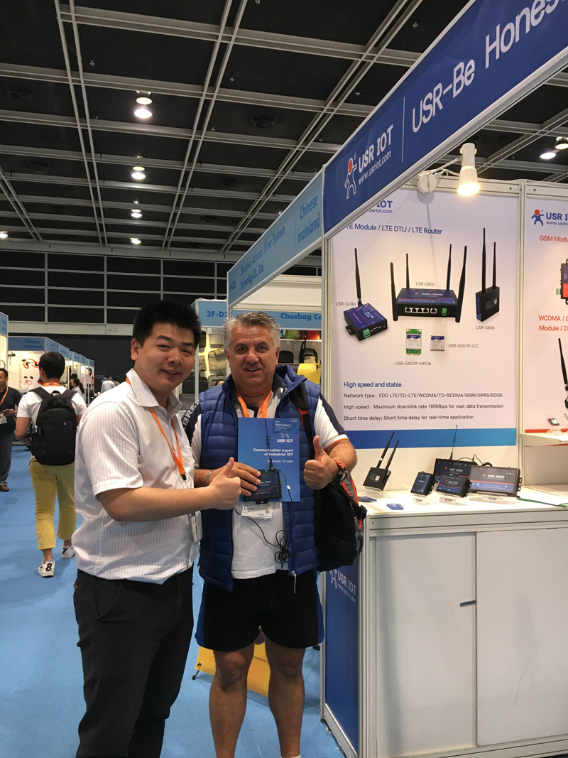 香港电子展会上,有人物联网不仅携带重量级的3G/4G工业路由器、DTU等,还带着最新产品——USR-G781。持续关注有人物联网公众账号的朋友们都知道,G781是一款工业级带网口的4G DTU。也就是说,如果PLC正在通过G781的串口采集数据时,还可以将G781的网口连接网络工控机,直接勘察现场情况。串口和双网口的自由选择,是非常受工控项目青睐的产品,引起展台上顾客的极大兴趣。
