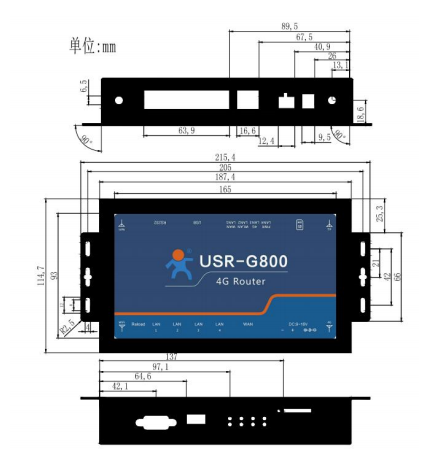 第二,USR-G800的外观尺寸如下图,产品边缘有挂耳,根据具体安装环境,适当使用。