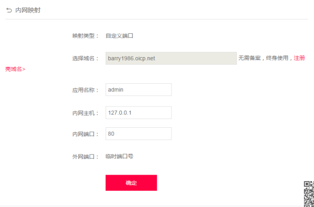 第七,添加、设置映射。网络类型选择自定义端口,域名选择选项选择要映射的域名。内网主机项填写需要映射的设备的IP地址,内网端口填写内网设备中的网络端口。