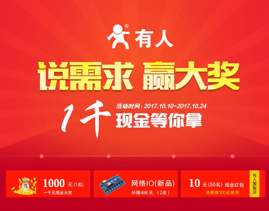 为了更好的了解用户对网络IO设备的使用选择和实际需求;为了让产品研发更有的放矢,解决用户痛点。“有人物联网”面向各行业发出有奖征集活动,说出你的真实需求和建议。