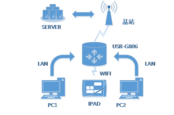 这样的组网方式下,路由器不需要进行任何设置,接上网线,插上拥有4G流量的SIM卡,给路由器供电即可。最大程度的减少了客户的设置过程,方便快捷。在这种组网方式下,路由器自带的WIFI的功能也可以同时工作,最大程度的增加用户的局域网的接入数量。