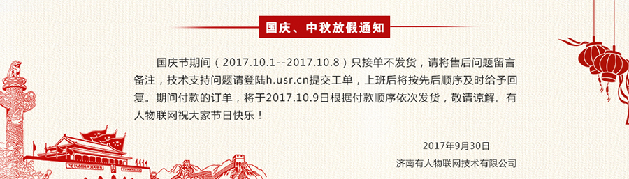 2017年国庆中秋双节即将到来,济南有人物联网全体员工提前恭祝广大新老客户,国庆快乐、生意兴隆、万事如意! 非常感谢您长期以来对我们工作的理解与支持。