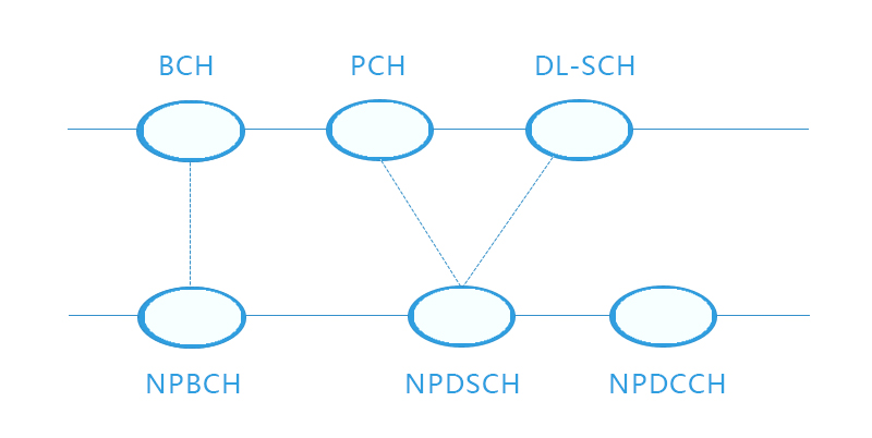 在NB-IoT系统中,数据链路层传输信道和物理层之间的映射关系进行了简化。NB-IoT下行链路层传输信道和物理层之间的映射关系。