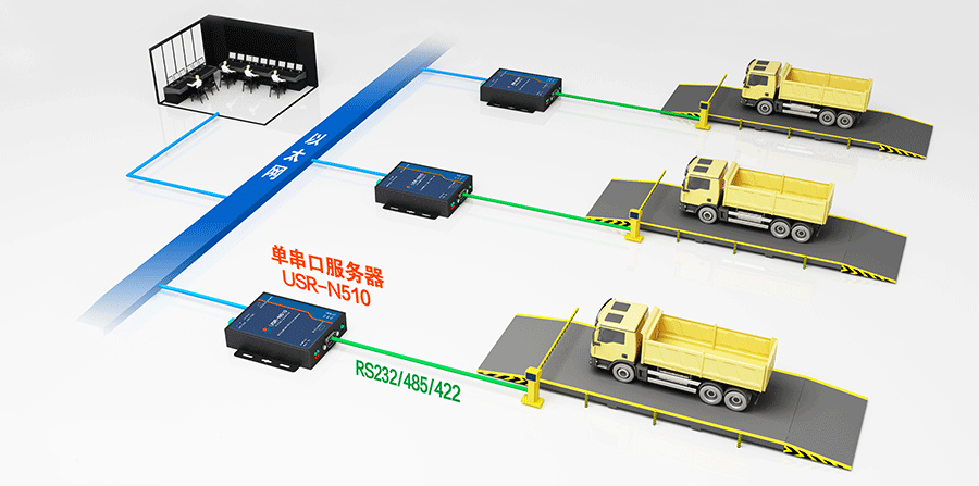 将串口服务器N510连接道闸,控制中心通过以太网远程控制道闸开关。