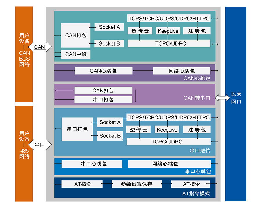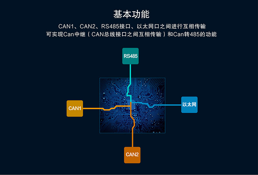 能实现CAN、以太网、RS485三者互转,应用灵活;