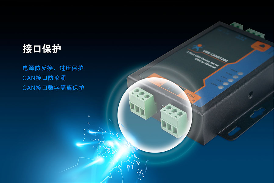 CANET200拥有CAN中继、CAN转RS485功能,实现CAN、以太网和RS485之间互相转换。在启用双服务器状态下,可实现两路Socket一管一控的功能,方便用户操作。