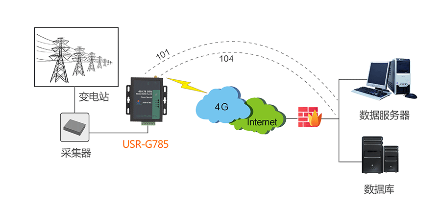 按照电力101协议传输数据,DTU作为子站端的一部分,只需将数据通过串口发给DTU,USR-G785就会将101报文发送给服务器。