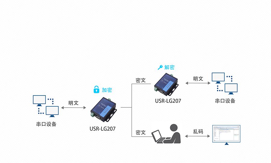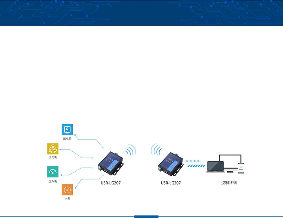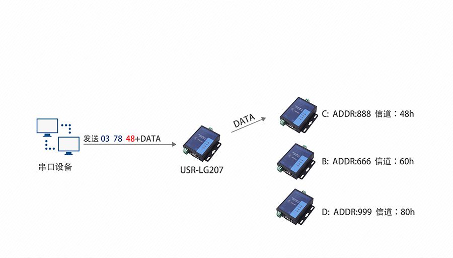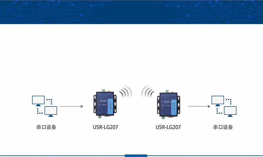 串口设备与串口设备之间通过两个USR-LG207进行点对点传输,无需任何数据传输协议。