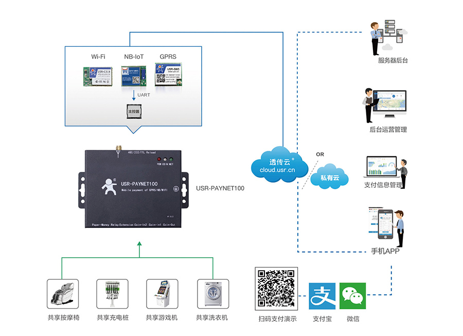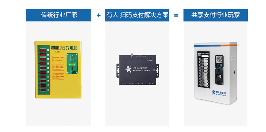 凡带有投币器接口的设备,借助有人物联网扫码支付解决方案,均可直接改造实现基于手机的扫码支付共享方案: