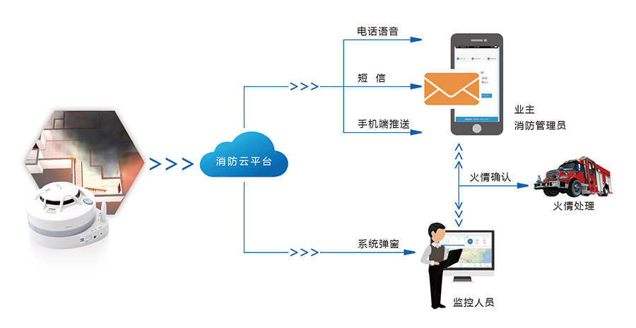 有人物联网智慧消防云平台通过电话自动语音、短信、手机端等多种形式,及时将火灾告警信息推送至业主和消防管理员,并同时发送短信、轮播语音通知相关联系人。火警通知将第一时间在管理监控平台弹窗提醒,监控人员可第一时间通过平台查找联系方式通知业主确认火情。