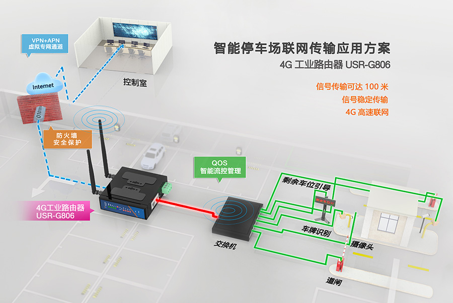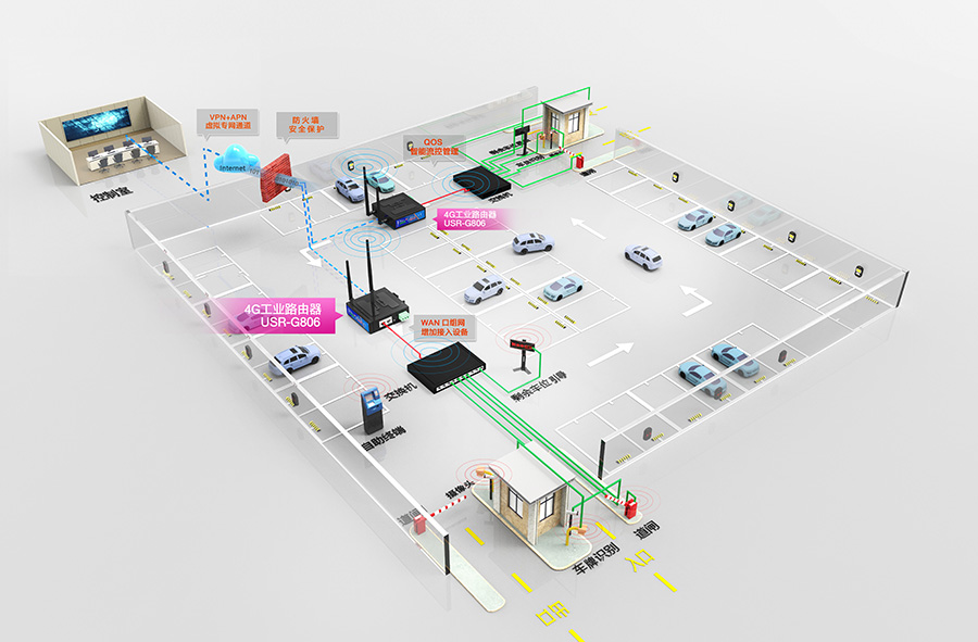此处,利用4G工业路由器对停车场道闸管理系统进行联网优化,实现运营管理数据的快速传输,提高工作效率,有效改善交通拥堵问题。
