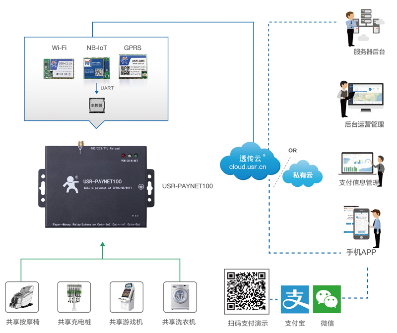 2、用户扫码完成支付,缴费信息通过4G模块迅速联网并传输至服务器后台;