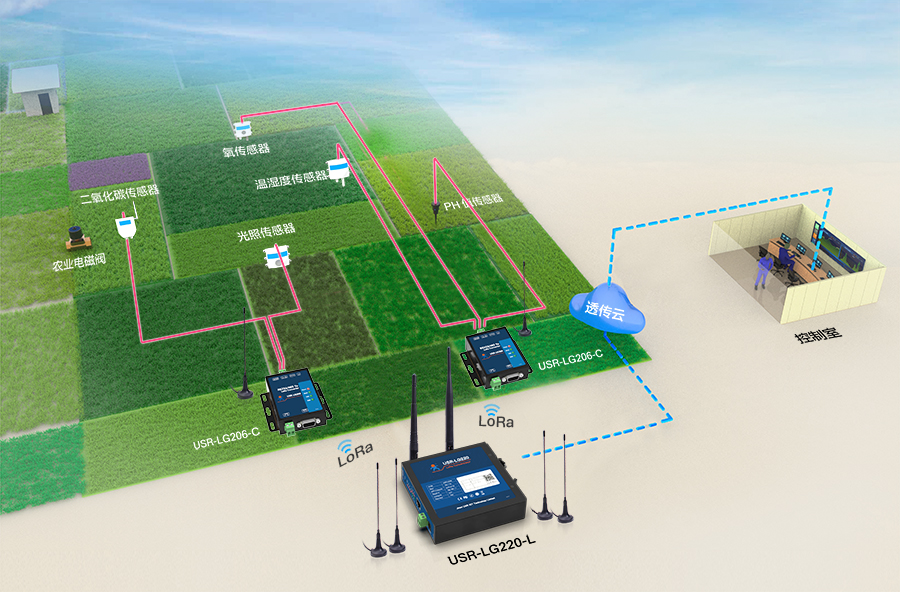 1、在农田里部署温湿度、二氧化碳、光照等终端传感器,通过RS232/485与LoRa数传终端USR-LG206-C相连