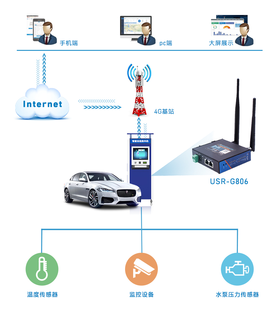 针对现实中遇到的问题,此处以4G工业路由器为例,描述如何帮助自助洗车机快速联网,从而实现无人操作的智能化场景。