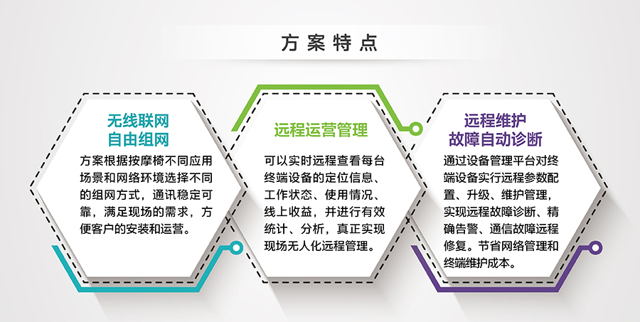 为方便运营商通过平台管理和监控所有按摩椅,为满足不用应用场景,有人物联网提出了基于无线通信技术的共享按摩解决方案,主要实现共享按摩椅的资产定位、机器运行状态数据的实时监控、信息灵活组网传输、远程控制等功能。