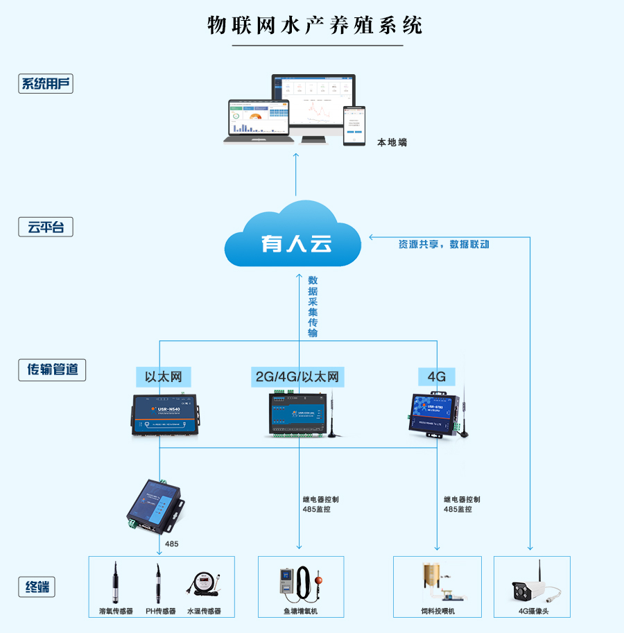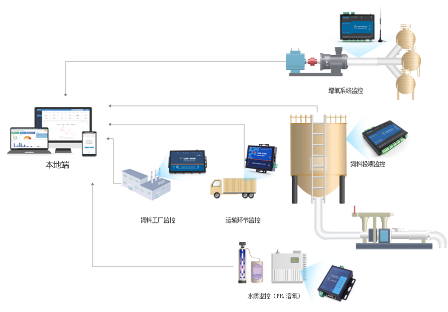 主要负责终端与云平台数据交互的桥梁,可提供包括Lora 、2G/4G多种组网方式,水质监测采用Lora 点对多方式配合串口服务器可实现覆盖大面积鱼塘数据采集,增氧控制采用IO808 可远程控制增氧机定时开启和关闭,并通过水质监测环节反馈控制增氧机。饲料投喂采用G780V2 4G DTU保证投料精准可靠,通过MODBUS协议控制投料机PLC投料过程,并可实时掌握饲料消耗。