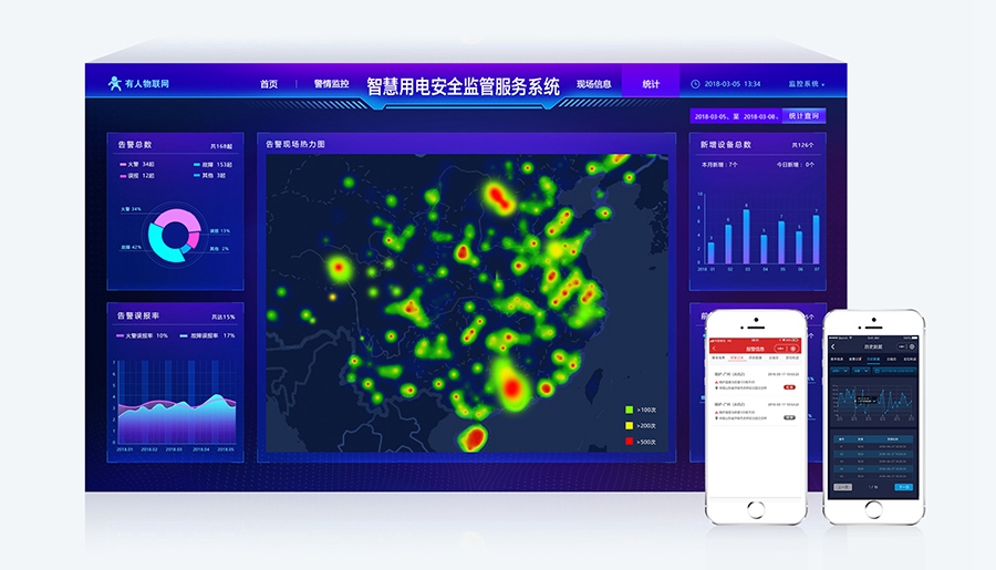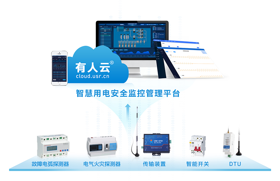 基于物联传感、移动互联、云计算技术及大数据等现代信息技术,用电安全监管服务系统由智能感知终端、无线传输设备、用电安全监管服务平台组成,智能感知终端将线路电气状态数据(线缆温度、电流、剩余电流、故障电弧)进行实时监测,并通过无线通讯方式将数据传送至用电安全监管服务平台。