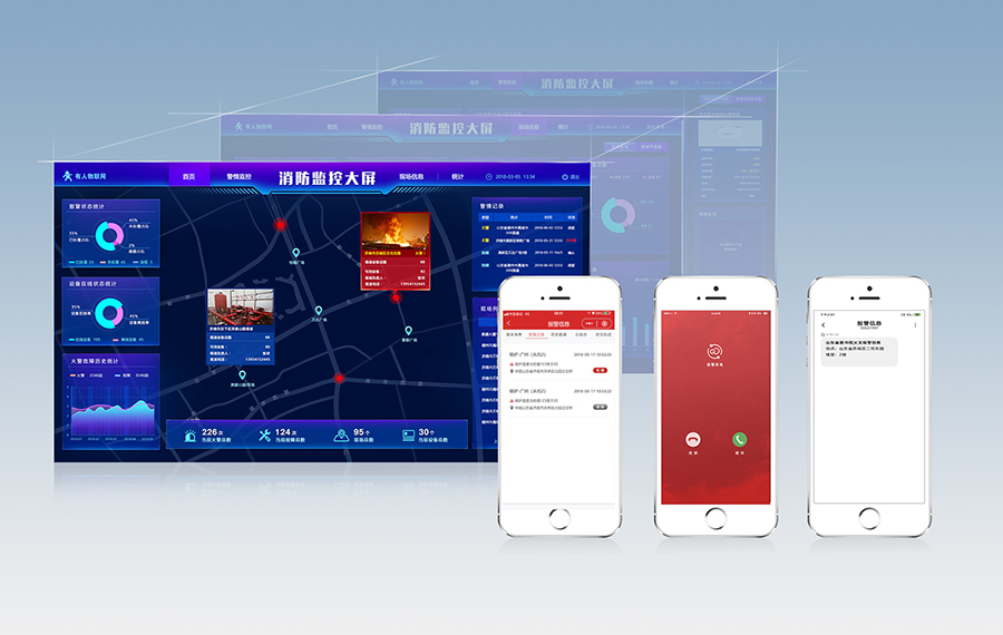 立体报警、多方推送:探测到火情后,通过探测器、平台、手机 APP、短信、电话立体报警,并将报警、故障等信息同时推送给消防监督员、社区网格员、物业管理人员、微型消防站等消防安全责任主体。