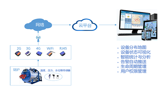 通过2G/3G/4G网络或宽带网络实现锅炉设备联网,实时接收锅炉设备运行参数,如温度、水位、压力参数等,并进行存储和管理。通过浏览器或手机客户端实时显示所有已联网设备的实时运行情况,对锅炉状态数据进行智能分析,为设备运维阶段故障分析、高效管理和稳定运行提供有力支持。
