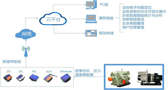 空气压缩机物联网监控系统,通过物联网技术利用2G/3G/4G网络实现远程监控管理功能,系统将各个客户终端空气压缩机控制器中的的数据信息传输到监控中心,客户使用网页登陆或手机APP方式,实现数据查看、修改、报警、统计、分析等。